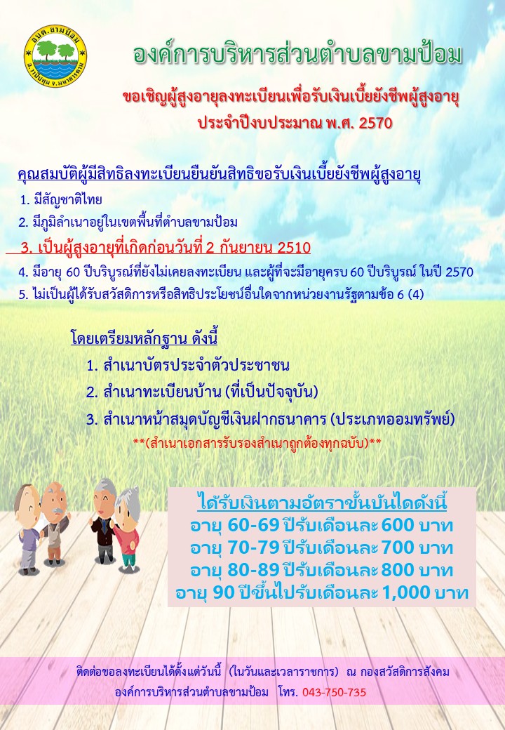 หัวข้อ :: ขอเชิญผู้สูงอายุลงทะเบียนเพื่อรับเงินเบี้ยยังชีพผู้สูงอายุ ประจำปีงบประมาณ พ.ศ. 2570