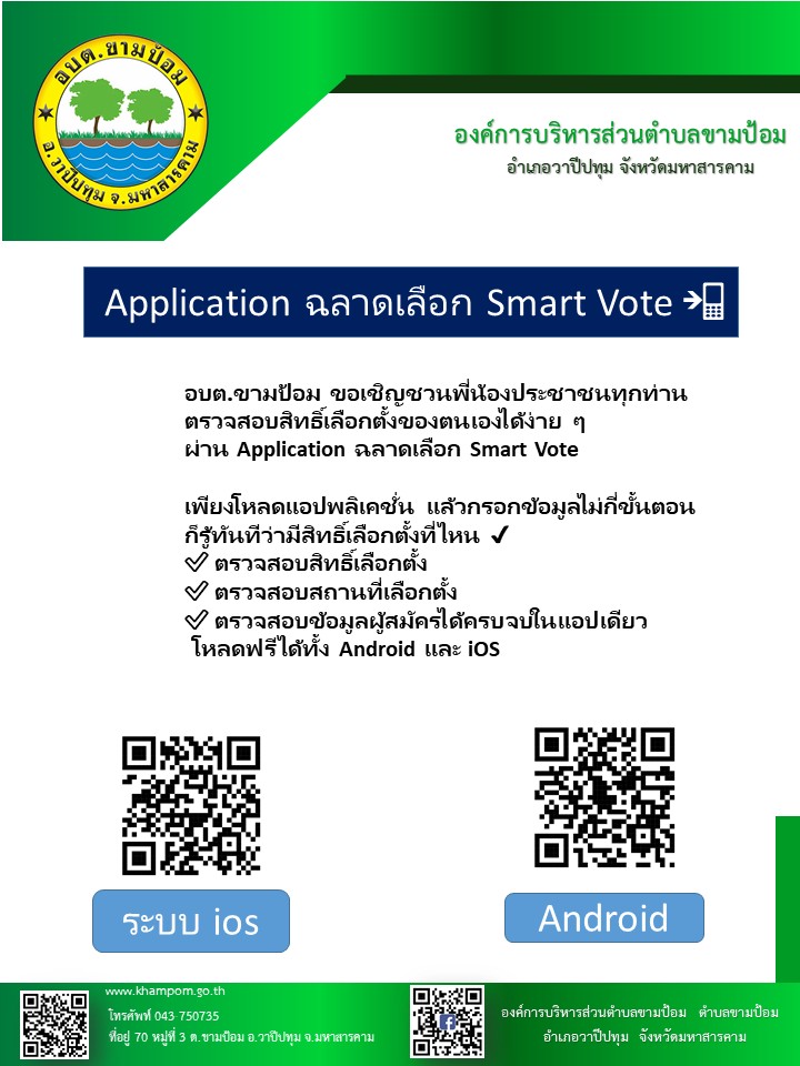 หัวข้อ :: อบต.ขามป้อม ขอเชิญชวนพี่น้องประชาชนทุกท่าน ตรวจสอบสิทธิ์เลือกตั้งของตนเองได้ง่าย ๆ ผ่าน Application ฉลาดเลือก Smart Vote