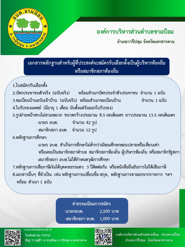 หัวข้อ :: ประชาสัมพันธ์องคืการบริหารส่วนตำบลขามป้อม เอกสารหลักฐานสำหรับผู้ที่ประสงค์จะสมัครรับเลือกตั้งเป็นผู้บริหารท้องถิ่น หรือสมาชิกสภาท้องถิ่น